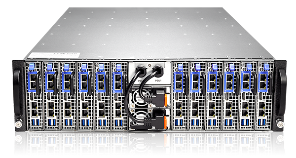 qy球友会(千亿)电子的S312-S24R刀片服务器集群系统3U机箱内包括12个E3 处理器刀片服务器,单个处理器带有2个视频处理核心,单个刀片可配置64G内存,2个6TB硬盘,整个系统可配置144TB存储容量,对建立基于云或 hadoop技术的视频处理系统,具有极高的性价比。服务器内部结构如下: